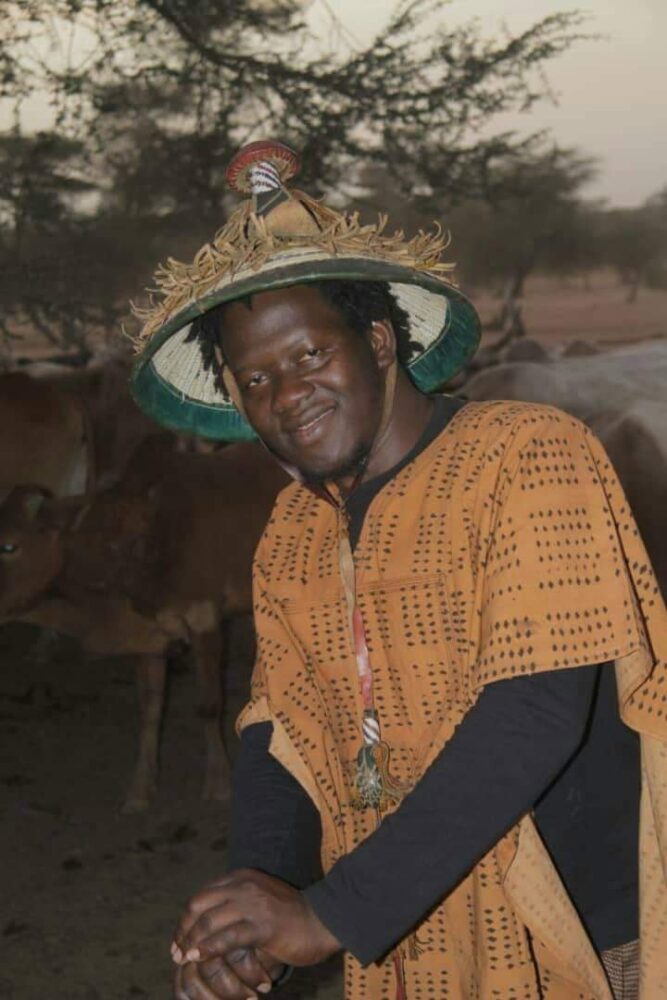 L’artiste en costume traditionnel avec son chapeau peul à côté des troupeaux dans la brousse, incarne son identité culturelle.