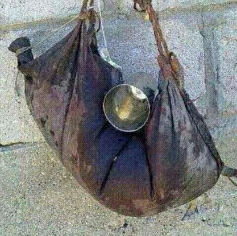 Gourde faite à partir de la peau d’ une chèvre en général parce qu’ elles ont une peau plus résistante que le mouton. On tane ça et puis on l utilisé pour rafraîchir l’ eau quel qu’ en soit la température et elle est toujours fraîche.