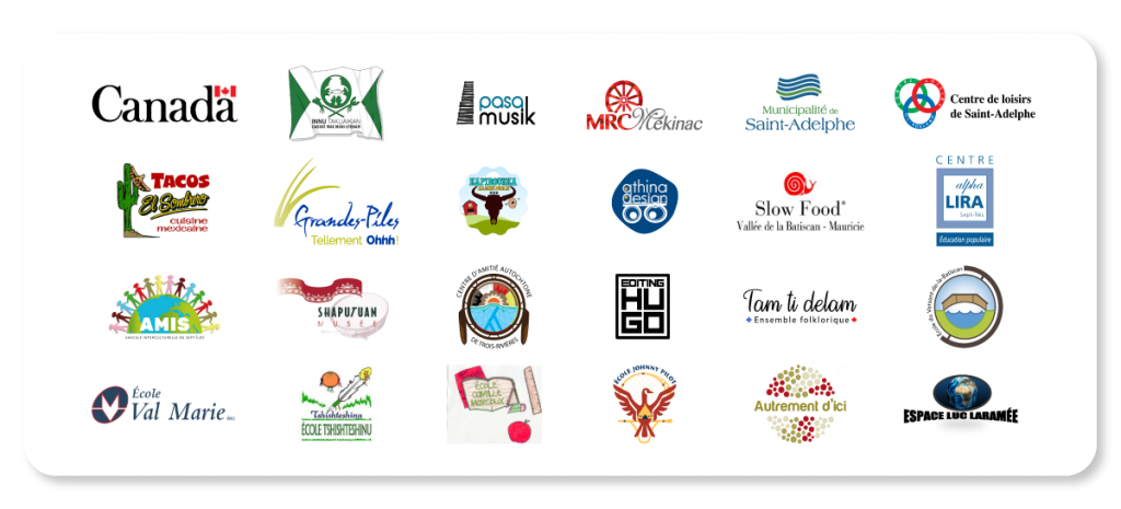 Ce projet est réalisé grâce à l’appui financier du Programme de soutien aux communautés, au multiculturalisme et à la lutte contre le racisme de Patrimoine canadien et en partenariat avec Innu Takuaikan Uashat Mak Mani-utenam, Pasa Musik, la MRC de Mékinac, la municipalité de Saint-Adelphe, la municipalité de Grandes-Piles, le restaurant Tacos El Sombrero de Sainte-Thècle et plus de 18 autres partenaires.