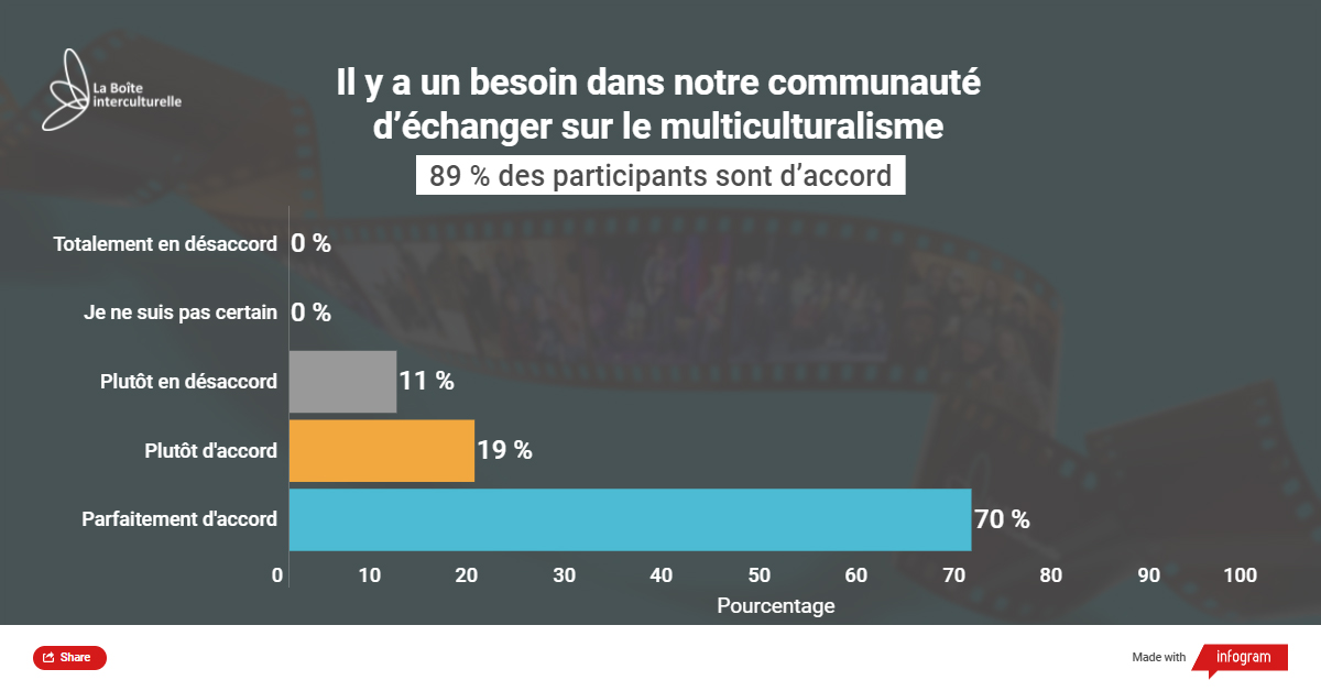 - Une grande majorité des répondants (89 %) étaient plutôt d’accord qu’il y a un besoin dans leur communauté d’échanger sur le multiculturalisme.