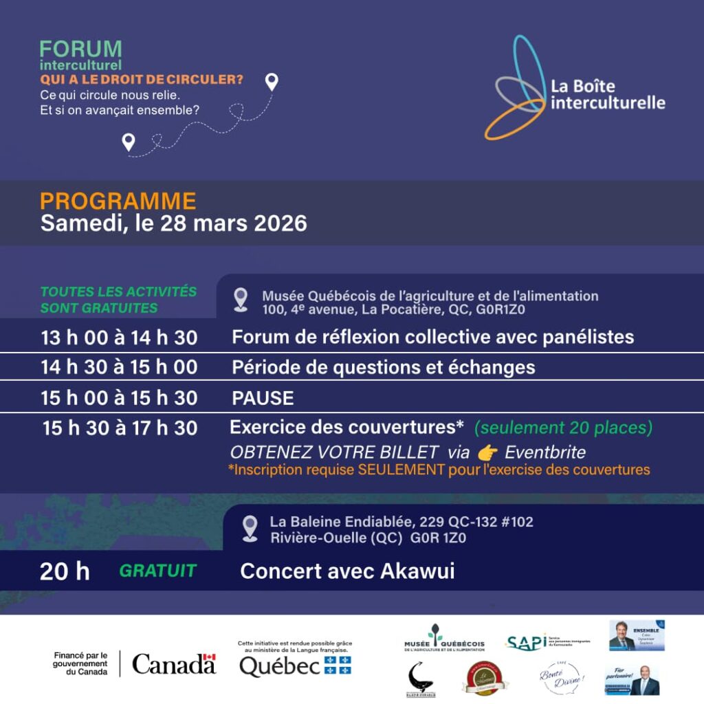 Premier Forum interculturel du Bas-Saint-Laurent est une invitation à se rencontrer, à jaser et à réfléchir ensemble à la façon de faire vivre des communautés rurales ouvertes, vivantes et solidaires. Dans une ambiance chaleureuse, on prend le temps d’échanger, d’écouter et de partager nos idées autour de questions qui nous concernent tous.